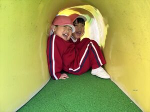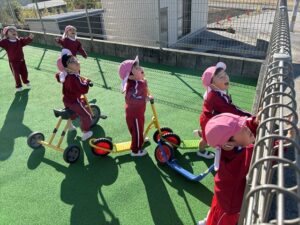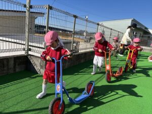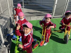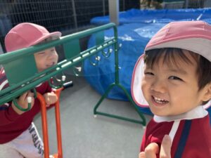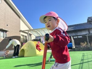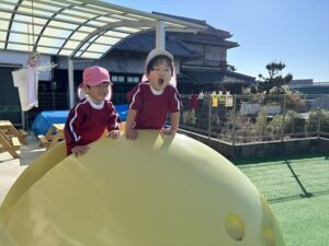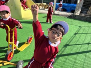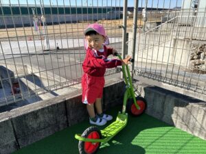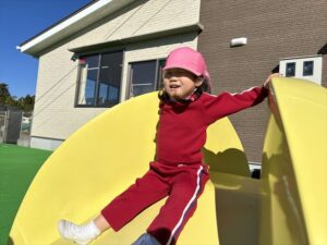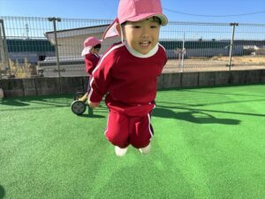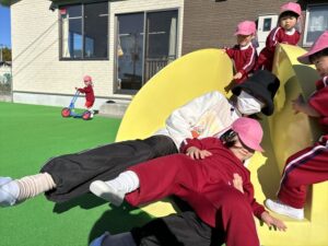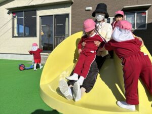 寒さなんかに負けないぞ!(虹組) 寒さなんかに負けないぞ!(虹組) 12月に入り、より一層寒くなりましたが、虹組さんは寒さに負けず元気いっぱいお外で遊んでいます🌈 スクーターをめぐって言い合いになることもありますが、貸してもらった時にはしっかり「ありがとう!」と笑顔で伝えている虹組さん 真っ青な空に飛行機やヘリコプターが見えるとバイバーイと手を振っています✨ 先生と一緒にソフトドームスライダーを滑るぞ!わぁ~ これからも沢山お外で遊ぼうね 2025年12月17日 : 2歳児クラス