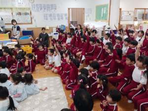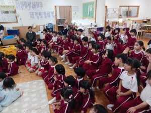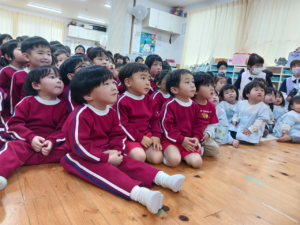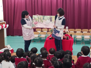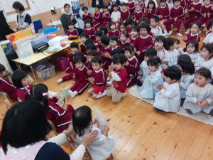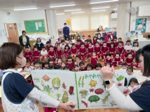 保育士からは、先月のマラソン大会にちなんで『おやおやおやさい』という、お野菜たちがかけっこをする、大型絵本の読み聞かせをしてもらいました✨
